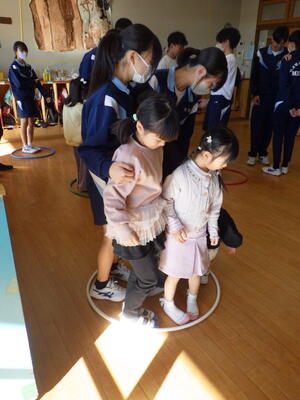 南中学校の3年3組のお兄さんお姉さんが家庭科の学習で保育実習に来てくれました。中学生の半分くらいの身長の園児ですので、目を合わせて話をしようと低い姿勢になってくれたり、やさしく声掛けをしてくれます。