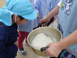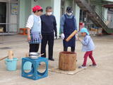 地域の皆様、保護者の皆様にご協力をいただき、餅つきをしました。昨日は臼や杵を使って餅つきの練習をしました。年長組の子どもたちがもち米を研いでくれました。