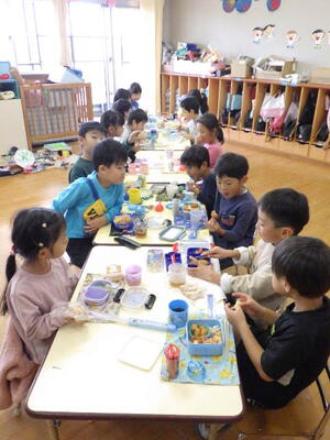 入れて!いいよ! 投稿: 園長 (13:46) 10月31日(金) お部屋や遊戯室、園庭でたくさん遊びました。「入れて!」「いいよ!」の声が聞こえてきました。 体をたくさん動かして遊んだので、お腹がぺこぺこです。「いただきます!」 -