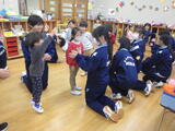 南中学校3年生家庭科保育実習Ⅱ 投稿: 園長 (14:31) 12月3日(水) 南中学校の3年生が家庭科の学習で保育実習に来てくれました。夢中になって一緒に遊びました。 <年少組のアルバム> <年中組のアルバム> <年長組のアルバム> -