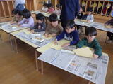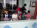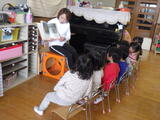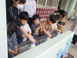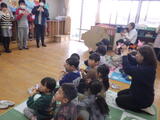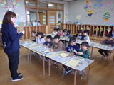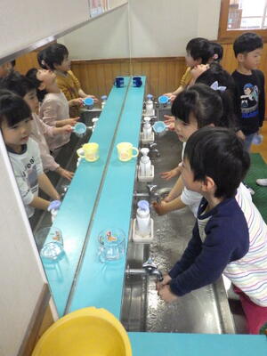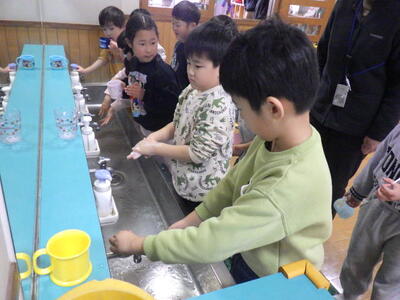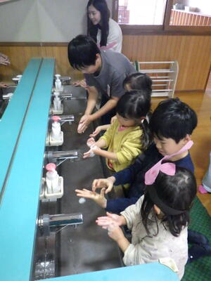 舟戸小学校の保健委員会の児童が「手の正しい洗い方」を年少組・年中組の園児に教えに来てくれました。舟戸小学校との交流活動の一つです。日頃から手洗い、うがいについて保育の中でも子どもたちに身につけさせます。今日は小学生が曲に合わせて手を洗う手本を見せて、アドバイスもしてくれました。