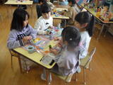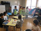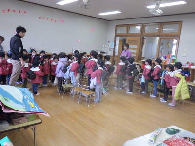 明日は「子どもお別れ会」です。年中組が進行役を務めます。年中組と年少組の子どもたちが年長組のお部屋に来て明日の「子どもお別れ会」への招待をしました。カレーパーティーも楽しみです。