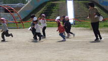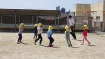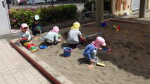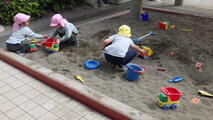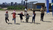 こいのぼりが元気よく泳ぐ園庭でごっこ遊びをしました。「ねこさん、ねこさん何が好き♪」を口ずさんで鬼ごっこをしたり、ボール遊びをしたり、砂場ではトラックの運転手になってたくさんの荷物を運んでいました。体を動かすと汗が出るくらいの気候になってきました。そのような中でも夢中になって遊んでいました。