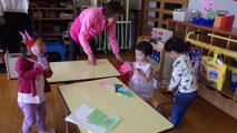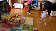 登園するとタオルやコップをリュックから出してフックに掛けたり、リュックをしまったり、朝の支度にも少しずつ慣れてきました。パーティーごっこではたくさんのおいしい料理をごちそうしてくれます。折り紙も大好きです。