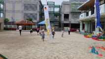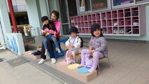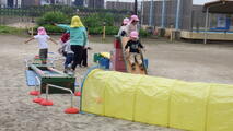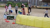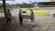 年長組の子どもたちが園庭でアスレチックをつくり始めました。コースも用具も自分たちで決めています。いつの間にかお客さんの入場ゲートもできていました。チケットをもらって、いよいよスタートです。