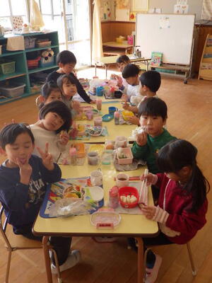 第2学期のお弁当最終日です。午前中にたくさん遊んでお腹がぺこぺこです。お弁当の時間が待ち遠しかったです。