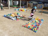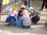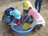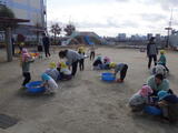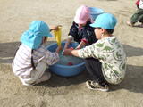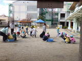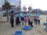 2学期も残り少なくなりました。たっぷり遊んだ後で、年長組の子どもたちが遊びに使った遊具を洗ってくれました。その様子を見ていた年中組や年少組の子どもたちも教えてもらいながら遊具を洗って干し始めました。